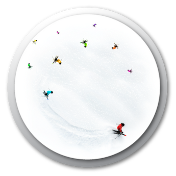 The white negative space represents fresh snow — possibility, openness, breath. The colourful skiers represent us at our most alive: playful, bold, unguarded.